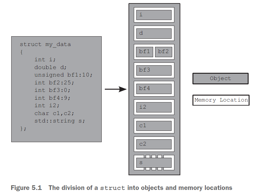 Whatever its type, an object is stored in one or more memory locations. Each memory location is either an object (or sub-object) of a scalar type such as unsigned short or my_class* or a sequence of adjacent bit fields. If you use bit fields, this is an important point to note: though adjacent bit fields are distinct objects, they’re still counted as the same memory location.