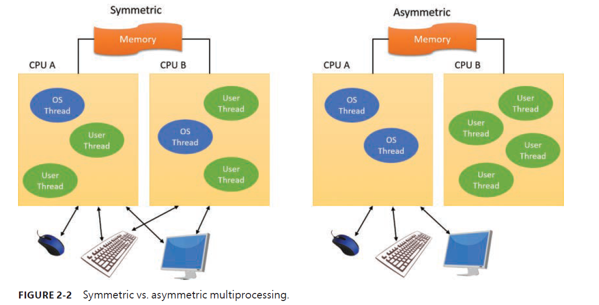 Windows is a symmetric multiprocessing (SMP) OS. There is no master processor——the OS as well as user threads can be scheduled to run on any processor. Also, all the processors share just one memory space. This module contrasts with asymmetric multiprocessing (ASMP), in which the OS typically selects one processor to execute OS kernel code while other processors run only user code.