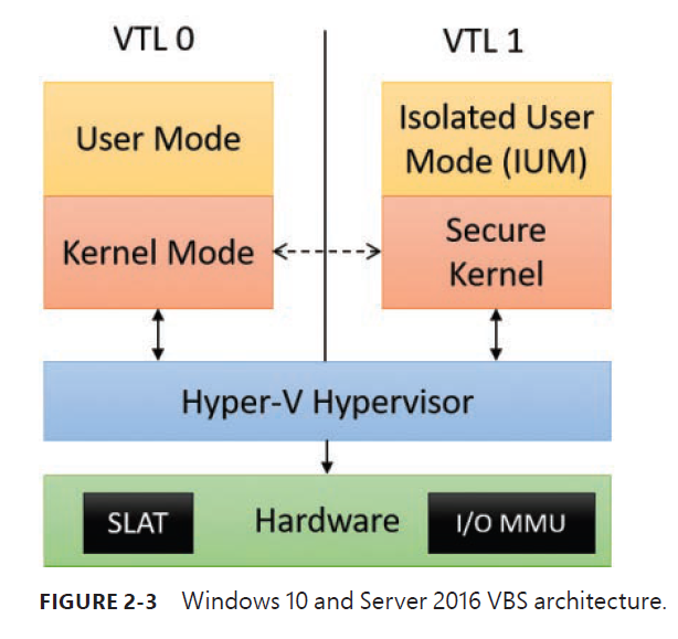 The user/kernel code is running on top of a Hyper-V hypervisor. The difference is that with VBS enabled, a VTL of 1 is now present, which contains its own secure kernel running in the privileged processor mode (that is, ring 0 on x86/x64).