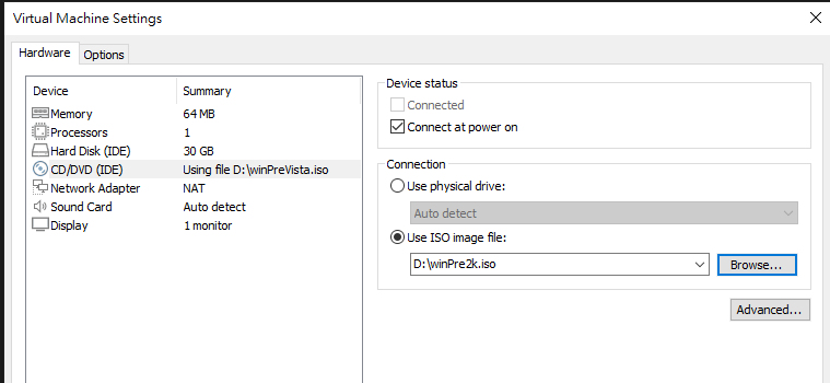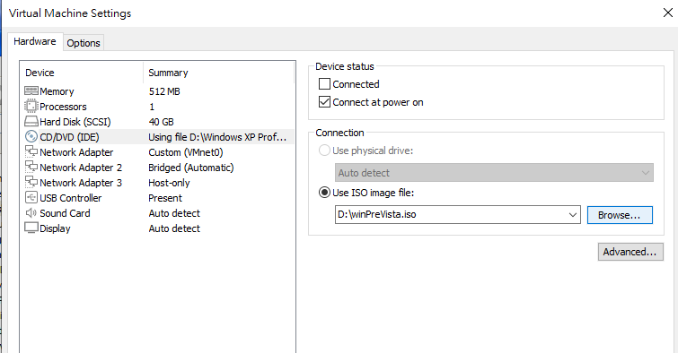 Select “CD/DVD” and modify the ISO image file path to the ISO file you downloaded eariler: