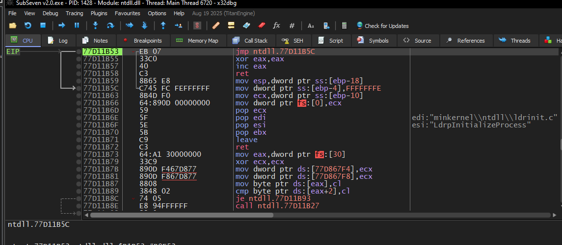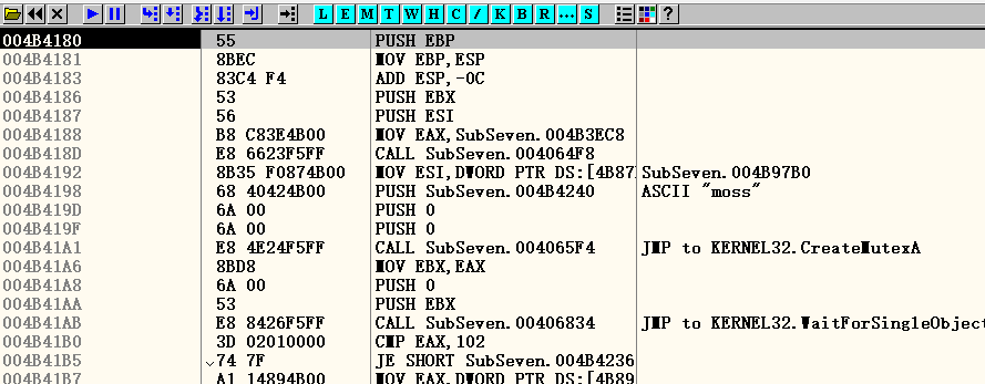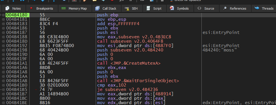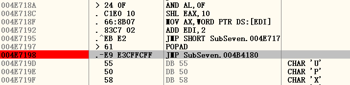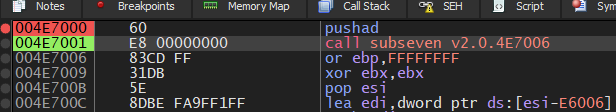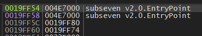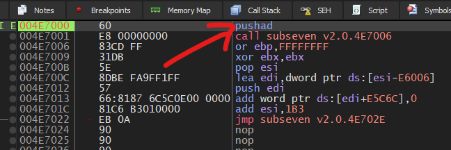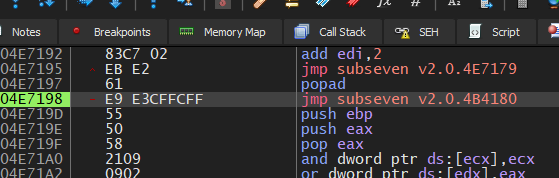 Now, press F7 to execute this instruction: jmp subseven v2.0.4B4180: