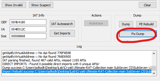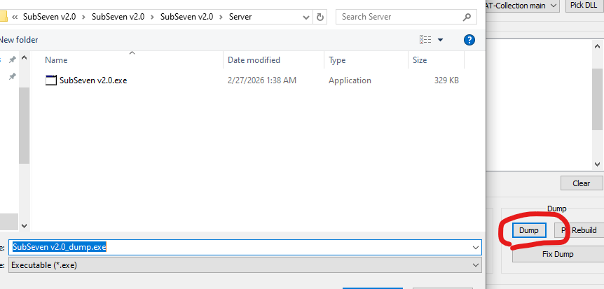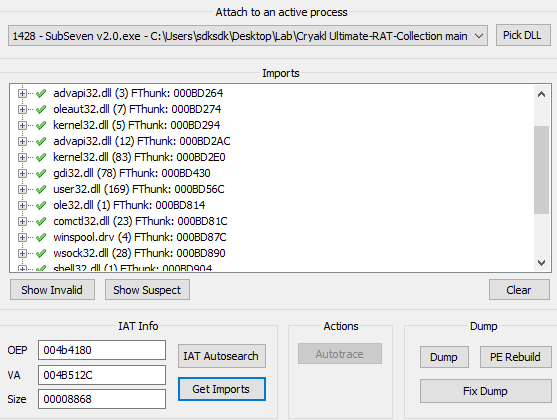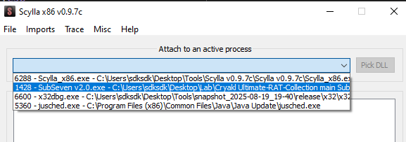 Note that we must use Scylla x86 since the Sub7 payload is an x86 PE file.