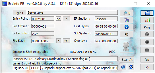 Notice that the version 2.0 payload is packed with UPX, while version 2.3 is packed with ASPack: