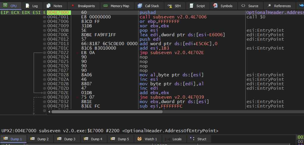 However, this is not the original entry point (OEP). The instruction pointer will eventually reach the OEP after the unpacking algorithm has been executed. UPX and ASPack implement the unpacking algorithm using the PUSHAD and POPAD instructions.