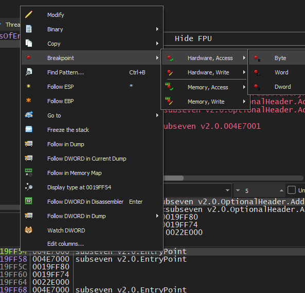 The address of the entry point is pushed onto the stack. Next, right-click the stack entry that stores the entry point address (0x004E7000) and navigate to: Breakpoint -> Hardware, Access -> Byte