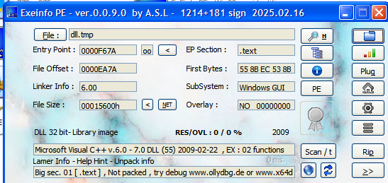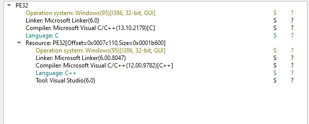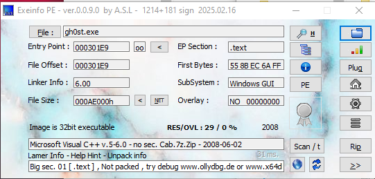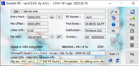 Both ExeInfo and DIE (Detect It Easy) confirmed that neither the payload nor the controller is packed, and both were compiled using Visual C++.