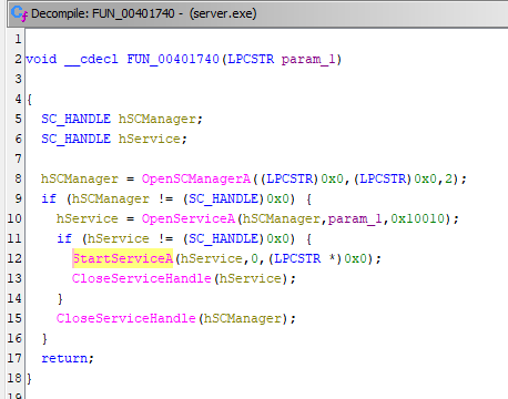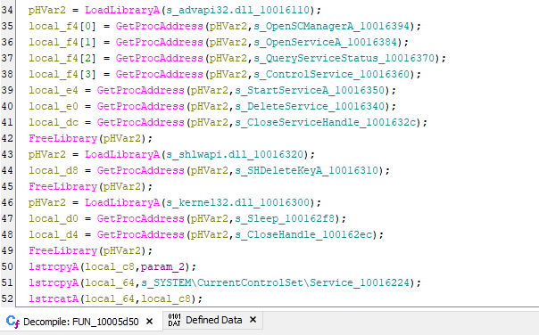 PUSH 0x2/CALL [ESI]: callOpenSCManagerA().ESIindicateslpBaseAddress.CALL [ESI + 0x4]: callOpenServiceA().param_2is the name of payload service name.CALL [ESI + 0xc]: callControlService, stop the service if it is still running.call [esi + 0X14]: callDeleteService(), remove the service data from the Windows service database.CALL [ESI + 0x1c]: callSHDeleteKeyA, delete the associated registry keys.