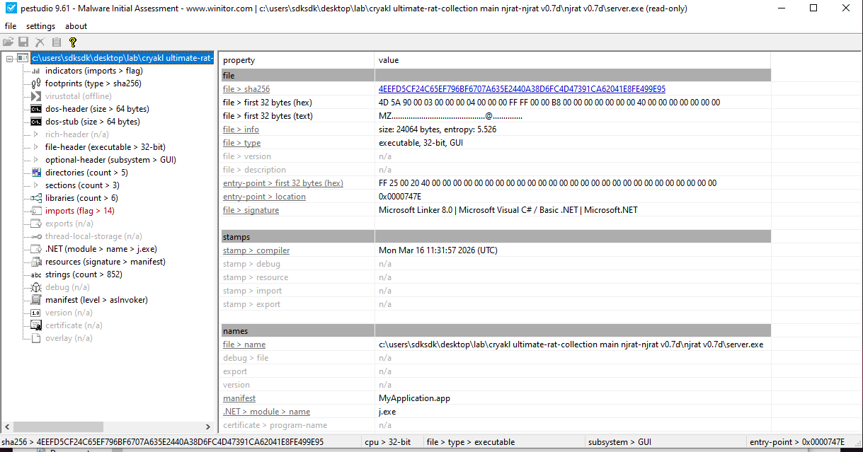 I then analyzed the sample using another tool, pestudio: