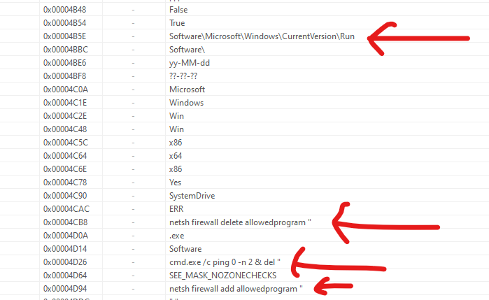 Software\Microsoft\Windows\CurrentVersion\Run: Persistence techniquenetsh firewall delete allowedprogramcmd.exe /c ping 0 -n 2 & del: Self-destructionnetsh firewall add allowedprogram