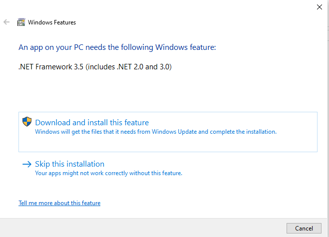 Therefore, if you want to run njRAT on Windows 10 as a C2 server, you need to install .NET Framework 3.5 for your Windows 10 machine: