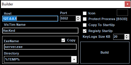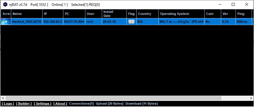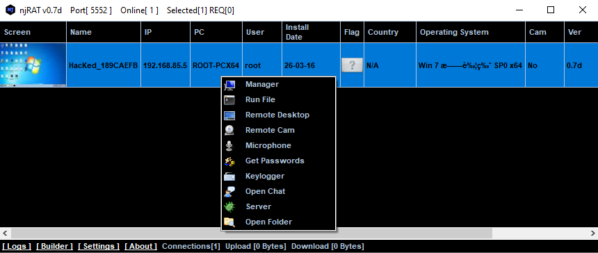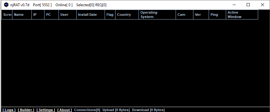After installing .NET Framework 3.5 runtime, we can launch the controller application. njRAT provides a straightforward graphical user interface for attackers: