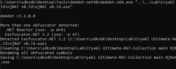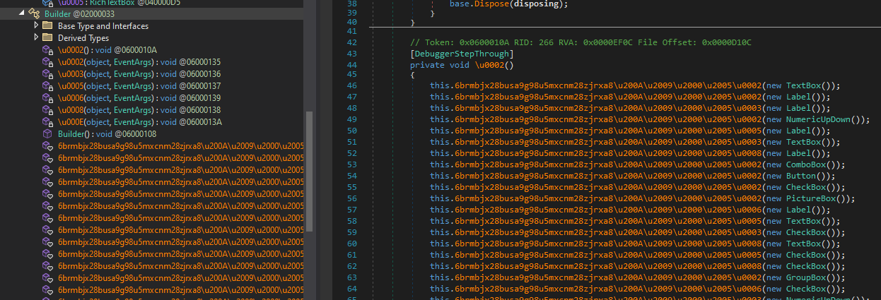 I also learned a lot while analyzing the controller application. I want to demonstrate how njRAT builds the payload. Therefore, I opened njRAT using dnSpy, but it was obfuscated: