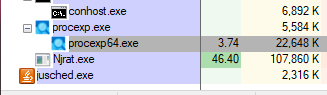 When I attempted to launch Njrat.exe (the controller application), it did not appear. Process Explorer showed that the process was created and then terminated immediately.