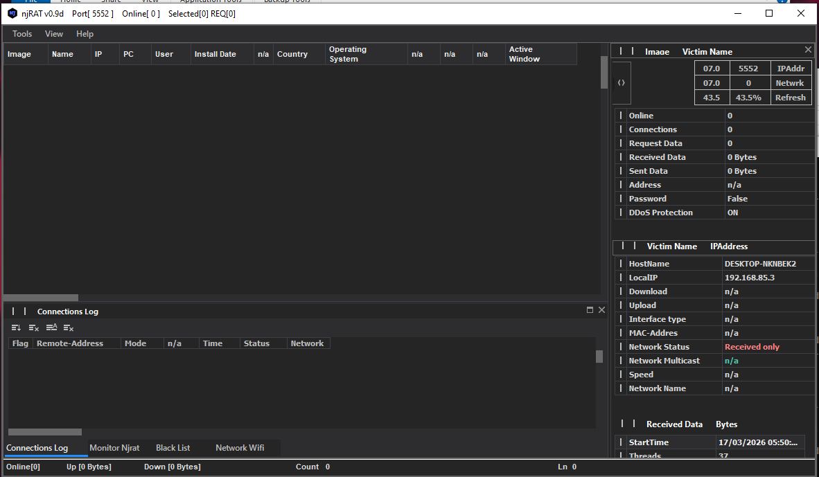 The njRAT application retrieves the country (or region) flag based on the public IP address of the compromised machine. Here, the flag was not shown properly because I isolated the network environment.
