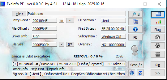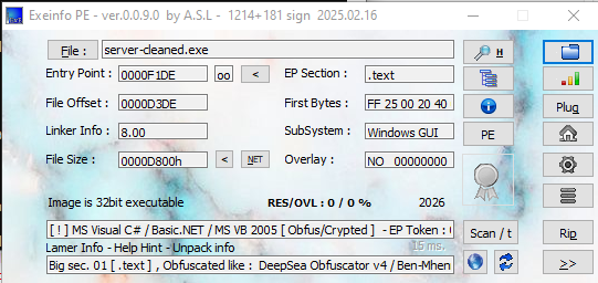 Open server_cleaned.exe and Patsh.exe using ExeInfo PE and DIE (Detect It Easy):
