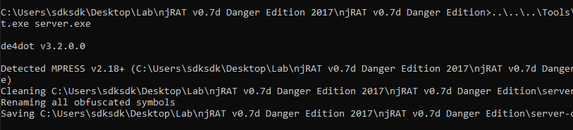 server.exe is compressed using Mpress. Therefore, I used de4dot to decompress it and saved it as server_cleaned.exe