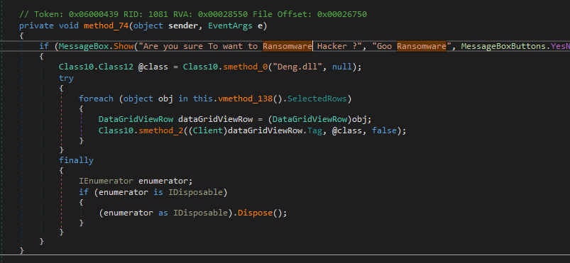 The controller application provides a Ransomware functionality. However, after further investigation, I believe this feature is incomplete since I did not find any class or keyword used for ransomware in both the payload and plugins.