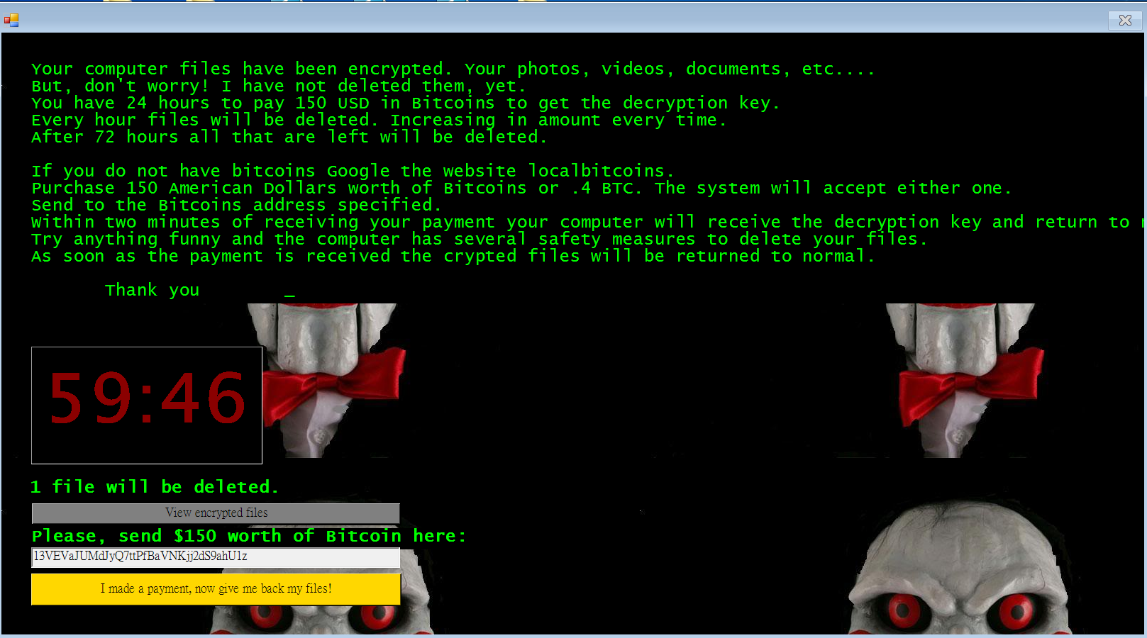 Jigsaw is a ransomware created in 2016. It was initially titled “BitcoinBlackmailer”, but later came to be known as “Jigsaw” due to featuring an image of “Billy the Puppet” from the “Saw” film franchise.
