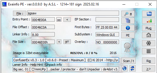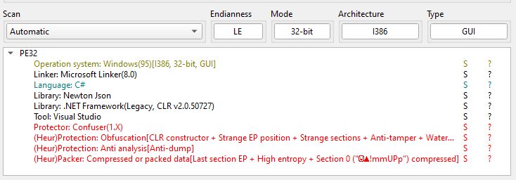 ExeInfo PE and DIE (Detect It Easy) confirmed that the payload is written in .NET. In addition, it is obfuscated via Confuser: