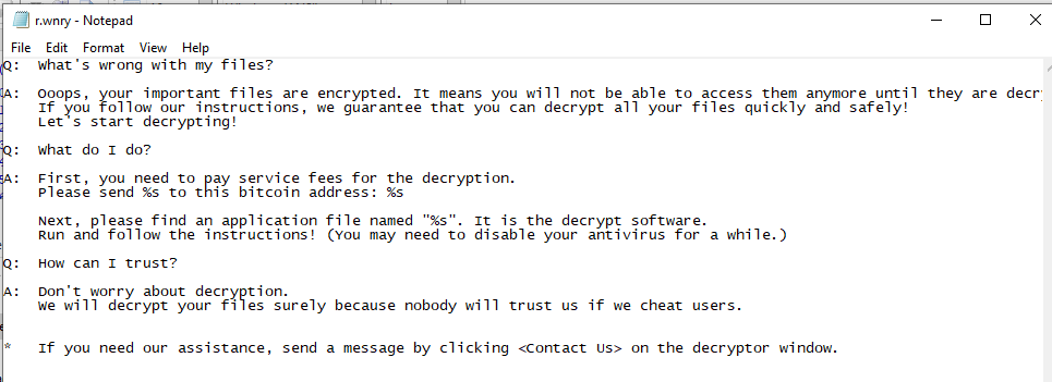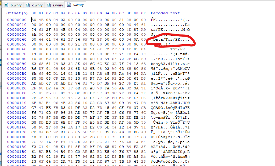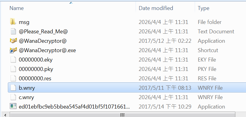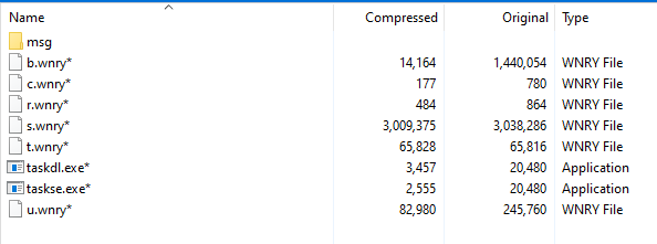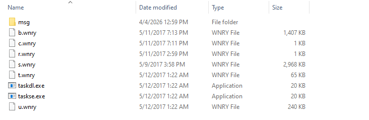 b.wnry: Wallpaper with extortion messagec.wnry: Stores the unique ID (consisting of a Bitcoin address) of victim machiner.wnry: README file, for displaying the extortion messages.wnry: Archive of TOR (The Onion Router)t.wnry: Encrypted core payload, a DLL filetaskdl.exe: Remove all encrypted filestaskse.exe: Privilege escalation toolu.wnry:@WanaDecryptor@.exe, the window form application for decryption and querying a decryption key