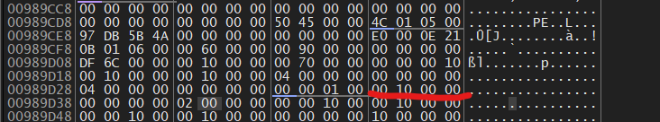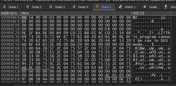x32dbg confirmed that the address of decrypted DLL in memory is 0x00989BE8, stored in EAX: