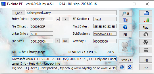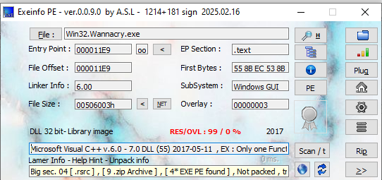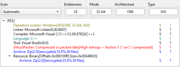 Both ExeInfo PE and DIE (Detect It Easy) confirmed that the malware is written in C++.