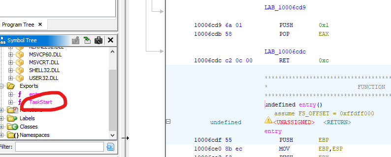 After opening the payload using Ghidra, the export function TaskStart confirmed that the payload is successfully decrypted and dumped: