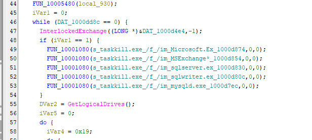 To ensure the files can be successfully encrypted, the malware terminates several database tools. If a database file is in use, it might not be successfully encrypted: