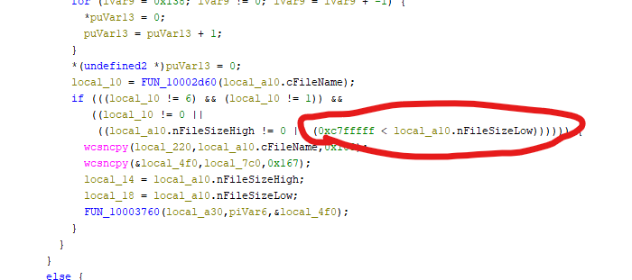 Here nFileSizeHigh != 0 indicates the file size is less than 4 GB, while 0xC7FFFFF is about 200 MB.