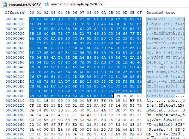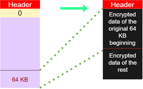 In pre-process phase (2nd round), the first 64 KB of a file is copied and appended to the end of the file. The first 64 KB will then be zeroed out and replaced by the “header” of WannaCry: