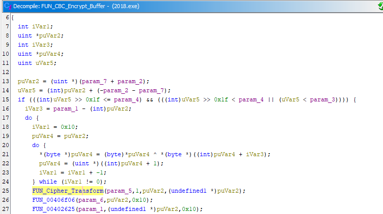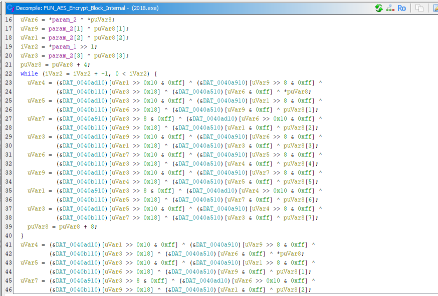 Instead of relying on standard cryptographic APIs, the malware implements AES internally.