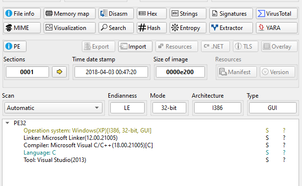 Open the malware using ExeInfo PE and DIE (Detect It Easy). Both tools confirmed that the malware is not packed: