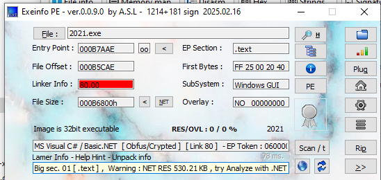 Open the malware using ExeInfo PE and DIE (Detect It Easy):