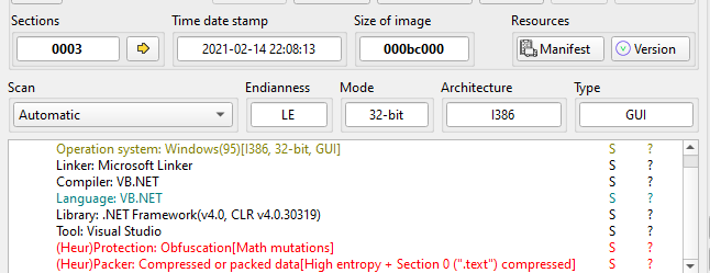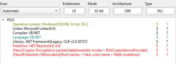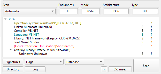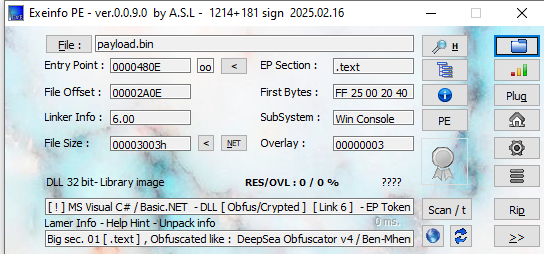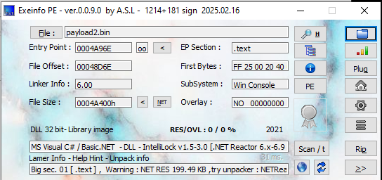 Open payload.bin using ExeInfo PE and DIE (Detect It Easy). Both tools confirmed it is a DLL file written in .NET. In addition, it is obfuscated.