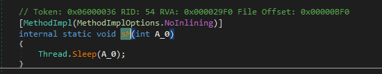 The payload pauses (Thread.Sleep) itself for a while. This behavior is likely intended for anti-analysis.