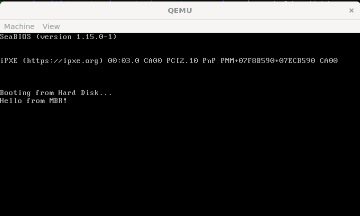 This is a minimal “Hello World” example of an MBR program written in assembly.