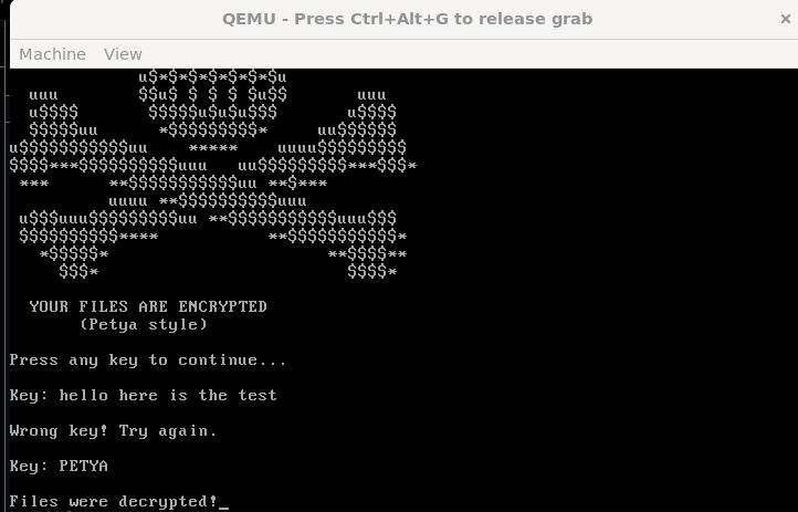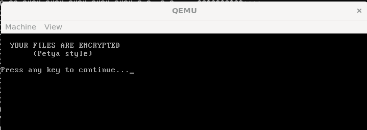 Note that the maximum size of MBR is 512 bytes. To simulate Petya-like boot-level behavior, I constructed a raw disk image containing both the MBR (stage 1) and the second-stage payload (stage 2).