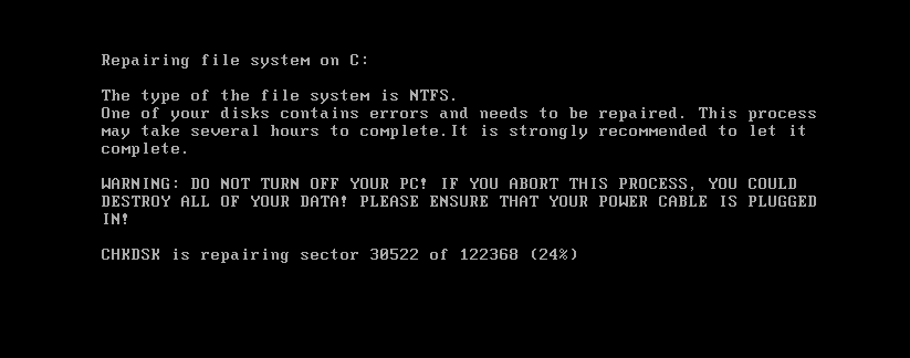 After successful execution, a fake CHKDSK screen with ASCII skull art is displayed: