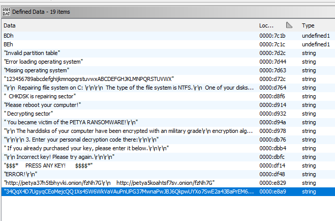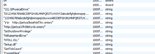I opened the DLL payload using Ghidra and found several keywords used in Petya malware: